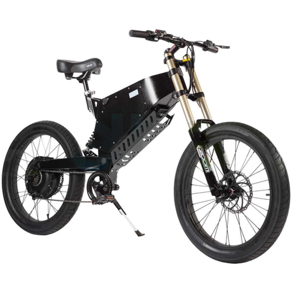 Основная конструкция рамы изготовлена из облегченного алюминия. При массе 58 кг максимальная грузоподъемность составляет 110 кг, достаточная для взрослого ездока. Велогибрид оснащен мощным движком – 2000 Вт, характеристики которого позволяют разогнаться до 50 км и на одном пробеге преодолеть расстояния до 90 км. С учетом режима рекуперации дальность езды может быть большей. Оснащенность байка амортизационной вилкой ЗУМ и задним фирменным амортизатором делает плавной езду на проблематичной местности. 24-дюймовая колесная часть байка оснащена широкими покрышками, накатистая и отлично сцепляемая с разными видами поверхностей. Анатомическое мотоседло снижает нагрузку с позвоночника, исключает ощущение усталости.