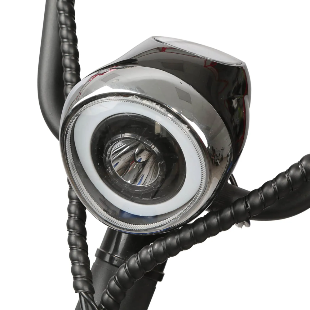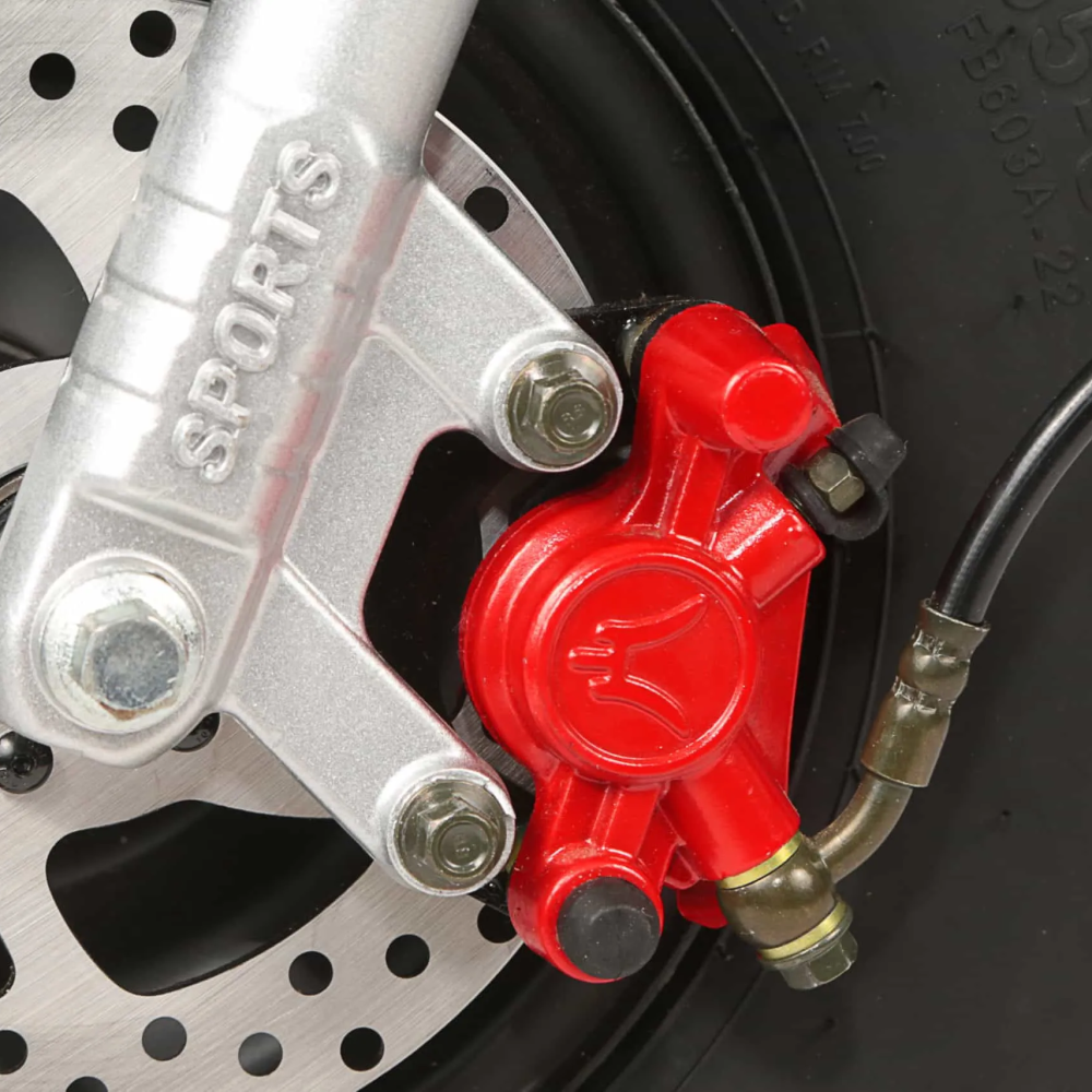 Электроскутер двухместный. Имеет аккумулятор под сидением в 20 ампер. При необходимости можно поставить еще один аккумулятор такой же емкостью. В итоге получится 40 ампер, что будет хватать на 90 км пробега. Модель имеет эргономическую форму сидения. Предусмотрена спинка для пассажира. Тормоза гидравлические. Имеет поворотники, яркий свет, громкий сигнал и ножки для заднего пассажира. В распоряжении пользователя Bluetooth колонки, которые можно подключать к смартфону для музыки. Возможно имитировать звук двигателя. Крылья в электроскутере выполнены в черном цвете, но при желании можно их поменять на другой дизайн.